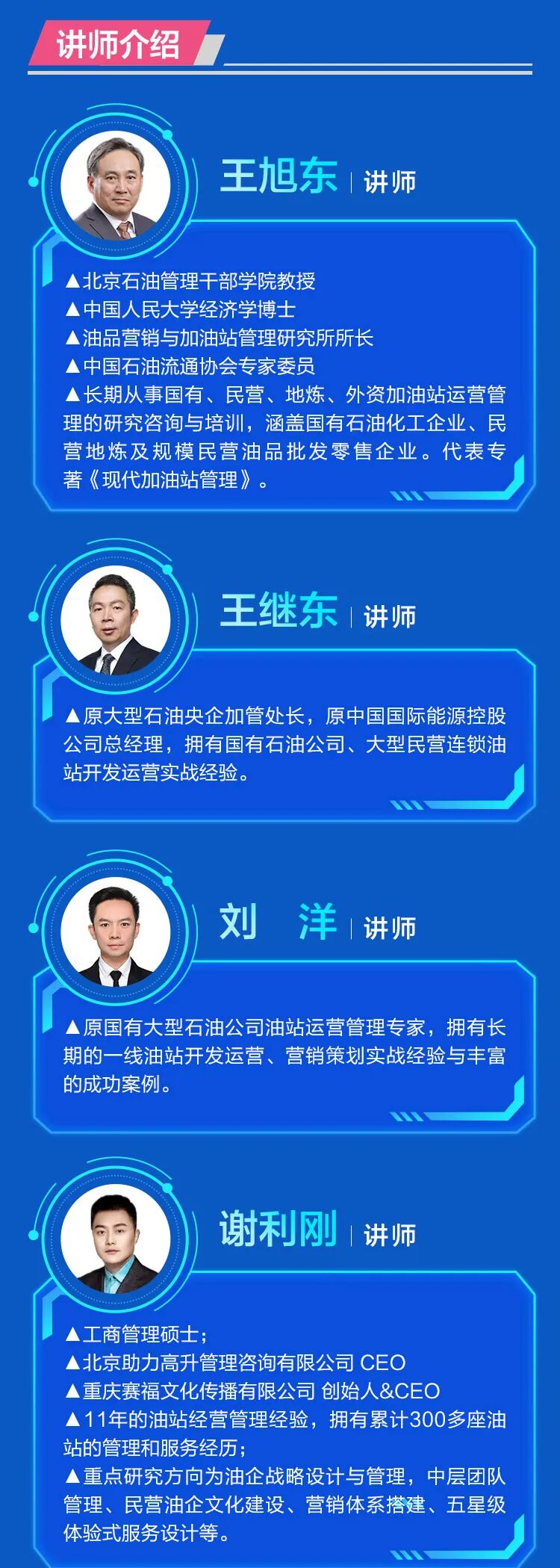 还有14法,将分别在9月10日、13日、14日、15日的15:00-17:00,由上述4位嘉嘉宾和谢利刚讲师在微吼平台直播分享,欢迎围观学习《加油站营销服务实战18法》,提高自己的营销服务技巧,进而令客户满意或为油站带来更多营收,从而获得老板的表扬、升职加薪。