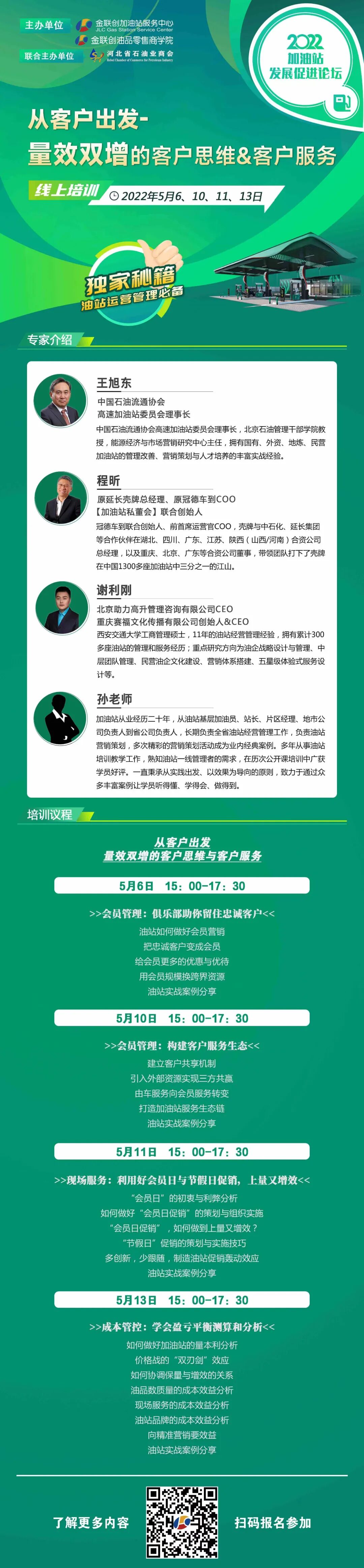 加油站在市场中永远受到客户的制约。客户用脚投票选出优秀的加油站,他们决定哪个加油站能生存、能发展,他们也会让一些加油站淘汰。那么,加油站如何构建客户服务生态以满足和挖掘客户的服务需求呢?5月10日下午,金联创加油站服务中心联合河北省石油业商会邀请孙老师线上分享《会员管理:构建客户服务生态》直播课:(1)建立客户共享机制;(2)引入外部资源实现三方共赢;(3)打造加油站服务生态链。加油站与合作伙伴为什么能共享客户?孙老师认为,加油站是超级流量入口,强调加油站要与合作方共享流量,从而为合作方赋能。具体点,加油站及其便利店要聚焦车主权益服务,不仅满足其加油、购物需求,还要通过赋能合作方满足客户的餐饮、生鲜、汽车服务、休息娱乐等需求。同时,孙老师还分享了汽油消费和柴油消费的特点。汽油消费的3个特点:(1)个体性,公务车改革、出租车油改气、私家车主、自用型;(2)便捷性,道路便捷、加油快捷、支付快捷、环境良好、服务优质;(3)区域性,就近原则、活动半径、相对固定。柴油消费的3个特点:(1)趋利性,经营型、成本型、雇佣型;(2)流动性:长途跨境、消费转移;(3)敏感性:价格、服务、安全、信息。加油站适合从哪些第三方引入合作资源?孙老师分享了3个方面的思路。第一,自带流量的超市、电影院、网红饭店、当地生活平台;第二,与汽车相关的保险公司、4S店、汽车美容店;第三,能增加客户权益的银行、电信、移动、视频会员等。孙老师在这部分还分享了生鲜超市、汽车后市场的案例。在生鲜超市的案例中,用户线上购买生鲜产品,收到相对应的加油币,从而带动加油。在汽车后市场案例中,主要包括洗美、保养、维修、保险、审车等,强调加油站要构建以油站为中心的车服务生态,形成差异化竞争优势。例如,为洗车客户送加油卡,从而带动客户加油。在打造加油站服务生态链方面,孙老师强调加油站要坚持“宽品类、窄品牌”的策略,将加油站打造为优选电商。例如,加油站要选择健身、电影、餐饮、蛋糕、生鲜、连锁超市、教育、娱乐、特色食品、洗车、美容美发、大药房、健康服务、福彩、便利店等品类的优质品牌构建一个强大的客户服务生态链。最后,感谢孙老师的精彩分享和学员的聆听。我们还将在5月11日、13日邀请程昕老师、谢利刚直播分享《现场服务:利用好会员日与节假日促销,上量又增效》、《成本管控:学会盈亏平衡测算和分析》课程,欢迎届时报名参加听课。