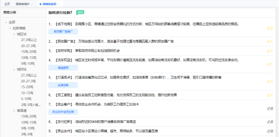 在功能上,每条营销策略后面都有点赞功能,点赞越多排序越靠前,油站可根据策略建议排序进行选择,通过策略指导实践,再通过实践反馈修正策略,实现营销策略的良性优化迭代,最终固化经验,实现营销智慧的线上化保存及分享。